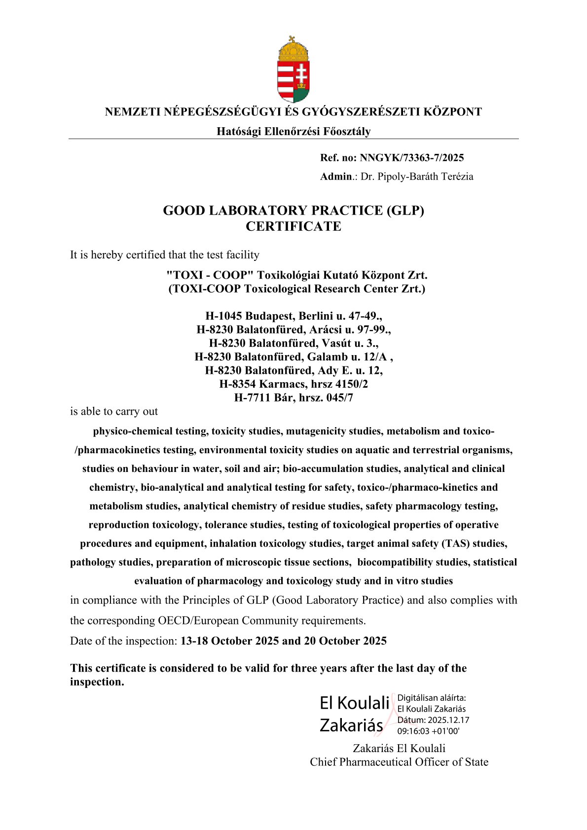 The certification according to the „Good Laboratory Practise” is fundamental for our work. Almost all studies are performed according to GLP regulations. Toxi-Coop Zrt. is certified according to the OECD Principles of Good Laboratory Practise since 2003 and the last inspection took place in 2025.